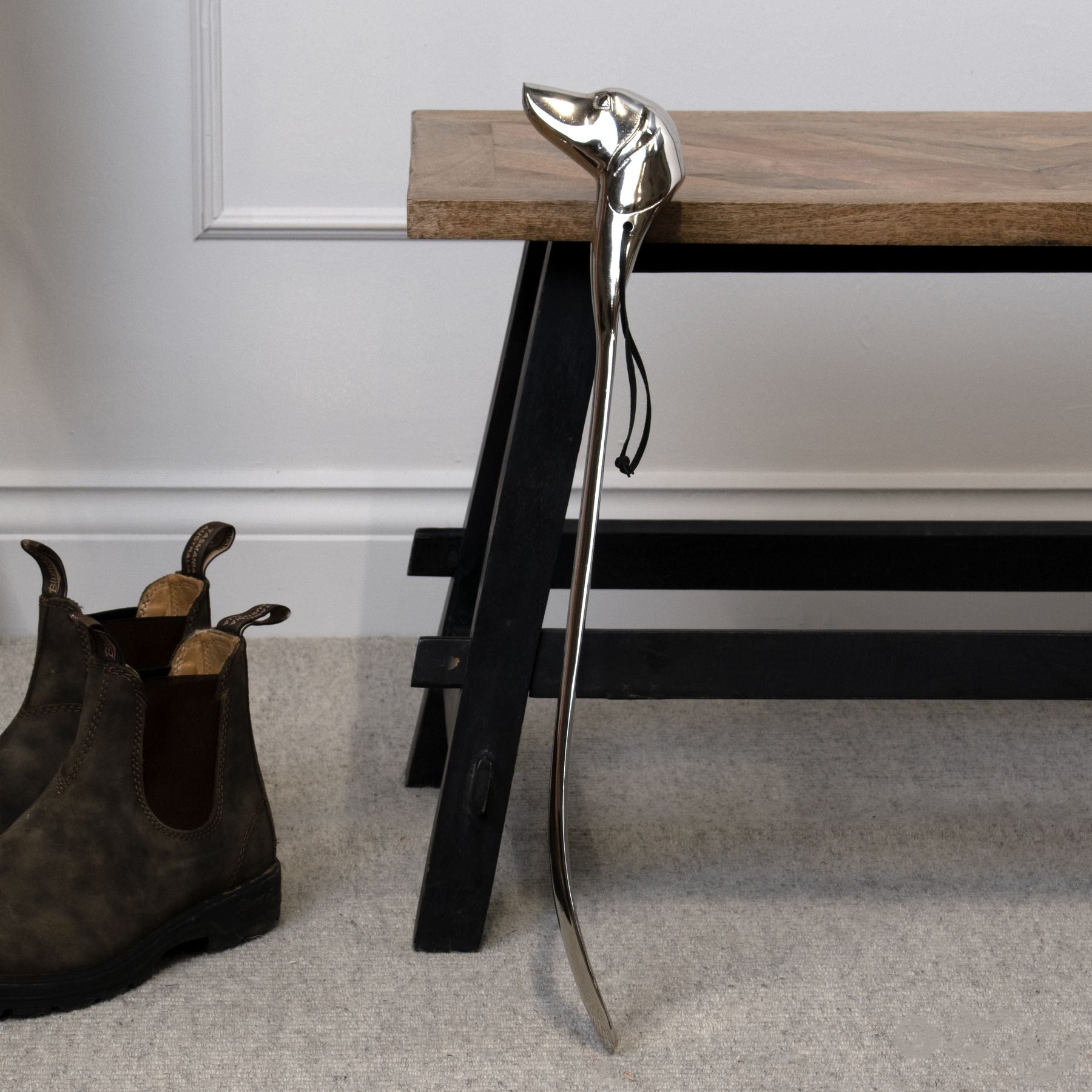 Masterfully crafted in silver nickel, this refined shoe horn presents a distinctive canine head design that marries practicality with luxurious aesthetics. The polished metallic surface reflects light beautifully, creating an air of refinement in any setting while serving an essential purpose. Part of an exclusive collection of distinctive accessories, this piece coordinates seamlessly with its companion designs featuring equestrian and stag motifs. The long-handled profile ensures comfortable use while maintaining an understated grace that appeals to discerning customers. For retailers seeking to create compelling displays, this shoe horn pairs magnificently with the matching silver nickel bottle stoppers in dog, horse, and stag designs, offering customers coordinated selections for thoughtful gifting or personal indulgence. The refined metallic finish harmonises with both traditional and modern décor schemes, making it an astute choice for retailers catering to varied clientele. When merchandised alongside our coordinating silver nickel accessories, this shoe horn becomes part of a cohesive collection that speaks to customers who value both functionality and refined décor. The substantial feel and weight of the piece communicates quality craftsmanship, while its practical application ensures it will become a cherished daily-use item in any home.