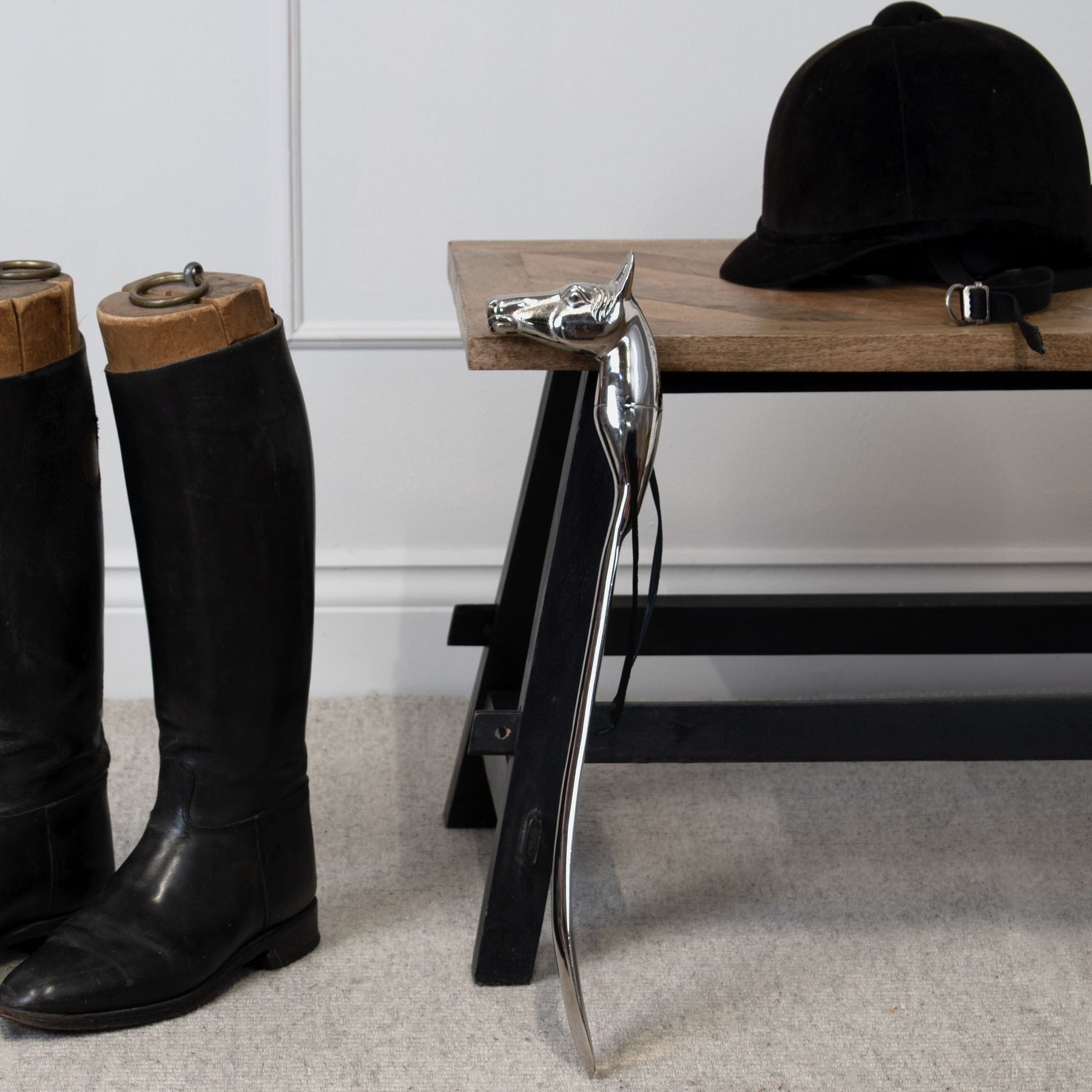 This impeccably crafted shoe horn marries practicality with refined aesthetics, showcasing a detailed equestrian motif that sets a new standard in functional accessories. The silver nickel finish creates an understated sheen that catches light beautifully while remaining durable for everyday use. The extended handle offers effortless utility while maintaining its decorative appeal through the thoughtfully proportioned horse head detail - a hallmark of this distinguished collection. The piece forms part of an exclusive range of silver nickel accessories, which includes complementary bottle stoppers and openers adorned with matching equestrian themes. For a cohesive entryway arrangement, consider pairing with the coordinating Horse Bottle Stopper and Horse Bottle Opener, or explore the parallel designs in stag and dog motifs from the same collection. This carefully considered assortment allows retailers to offer customers complete sets that maintain visual consistency throughout their homes. The understated lustre of the finish ensures enduring appeal across varying interior styles, from minimalist modern to classic country house aesthetics. Each piece demonstrates superior attention to detail in its execution, making it an outstanding choice for discerning customers seeking practical luxury items that surpass ordinary household accessories.